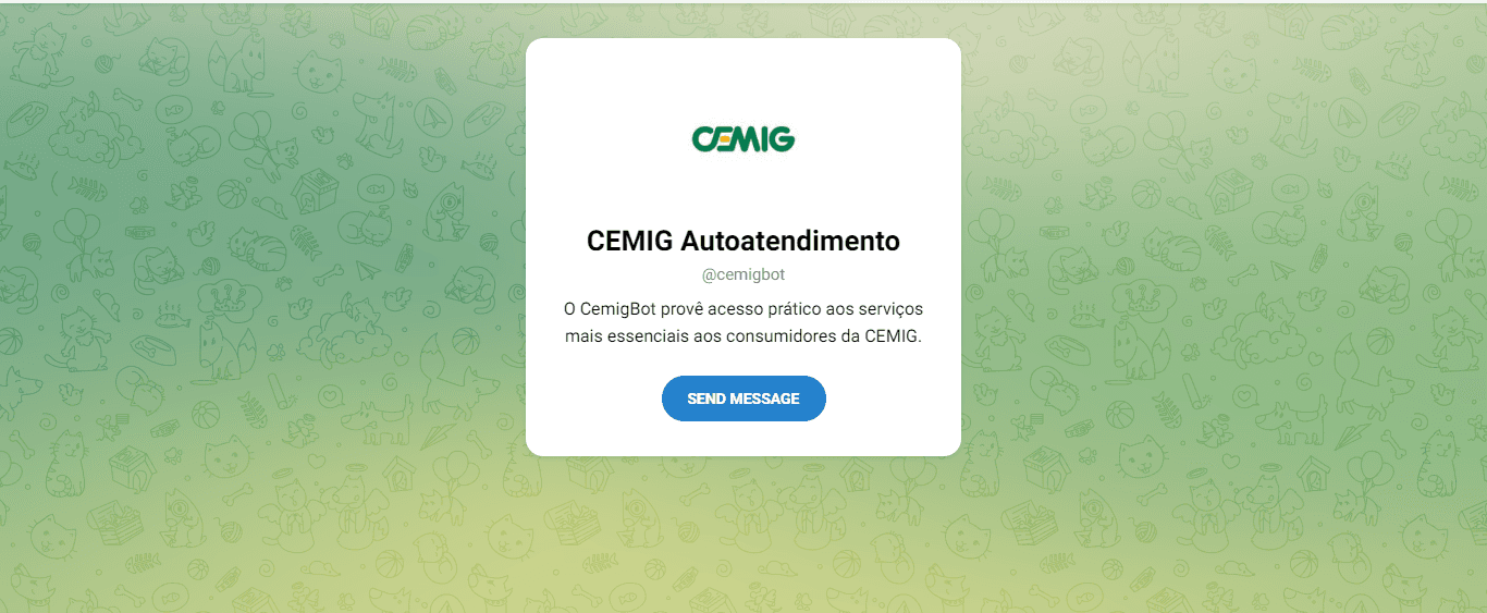 A Cemig também está disponível para atendimento pelo aplicativo de mensagens Telegram. O atendimento é feito através de mensagens automáticas. Clique aqui para entrar em contato com a Cemig pelo Telegram.
