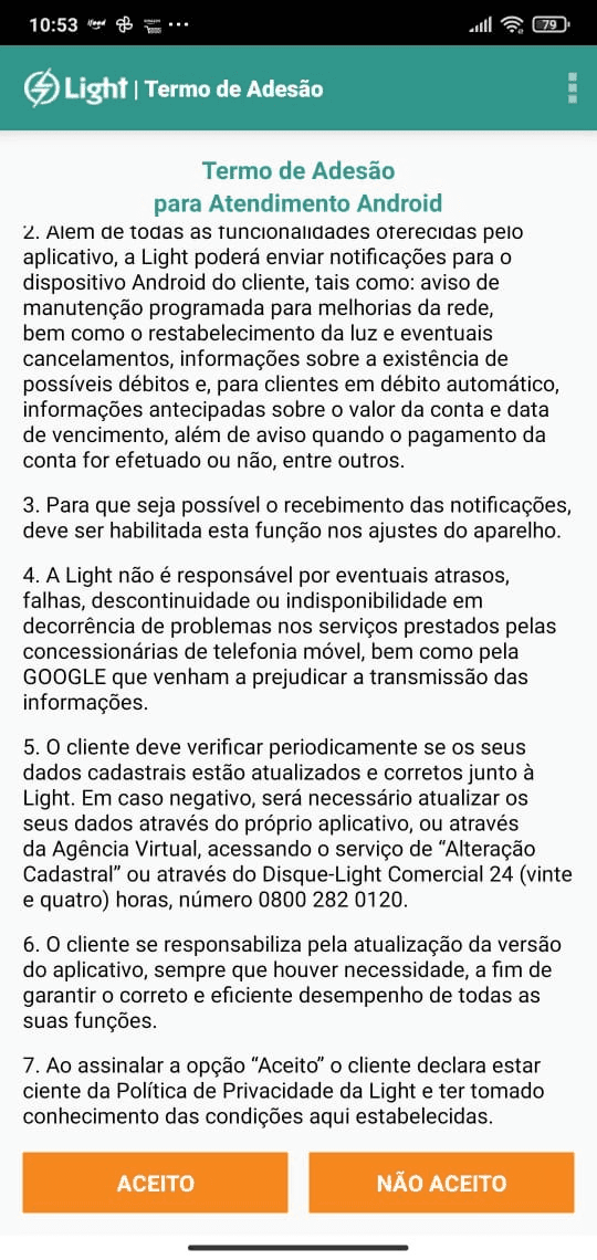 2) Leia e aceite os termos de adesão para acessar o aplicativo.