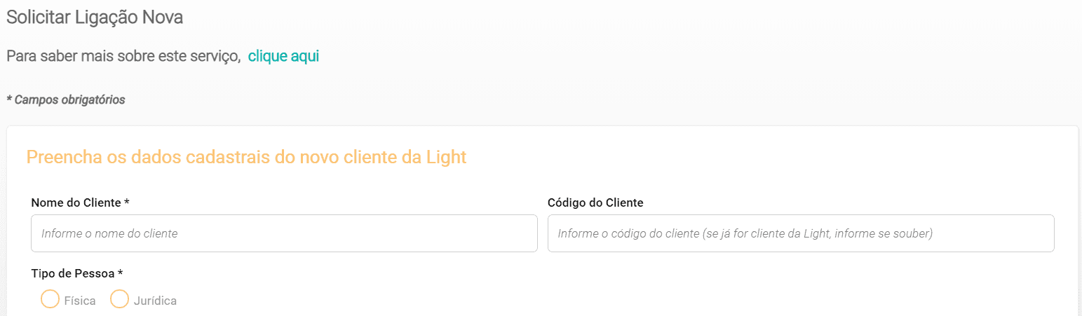 5) Para cadastrar a ligação, preencha os dados cadastrais do novo titular. Informe o nome do cliente, código do cliente (caso já seja cliente da Light) e tipo de pessoa (física ou jurídica).