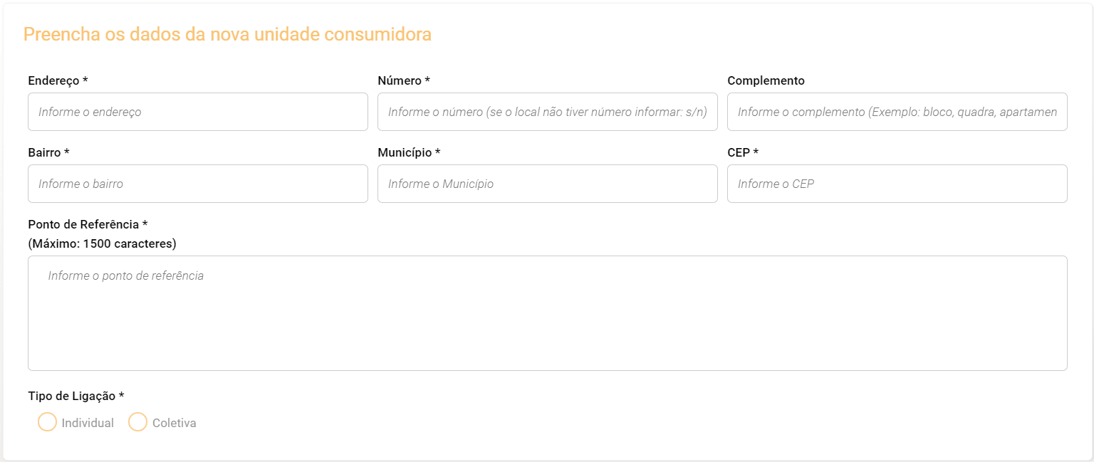 8) Preencha os dados de endereço, ponto de referência e tipo de ligação da nova unidade consumidora de luz.