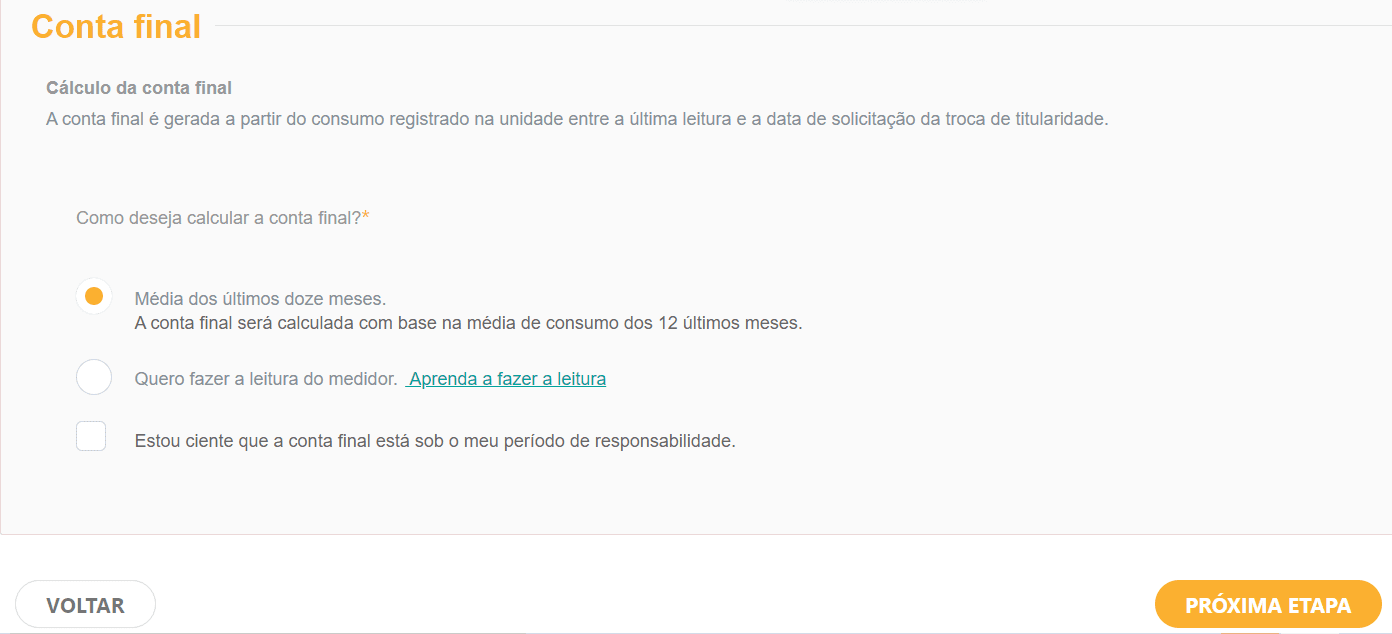 8) Emita a conta final de luz, que corresponde ao período entre a última leitura e a data de solicitação da mudança de titularidade