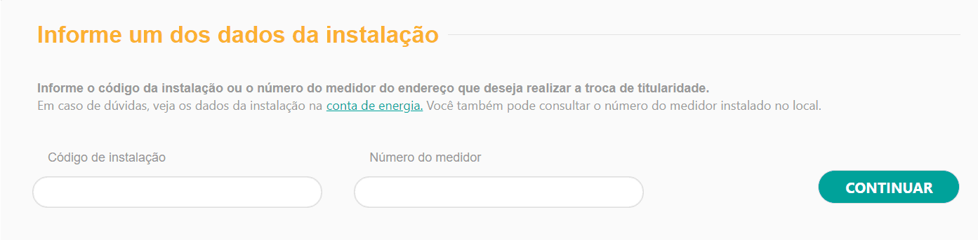 6) Digite o código de instalação ou o número do medidor da instalação que você deseja mudar a titularidade.