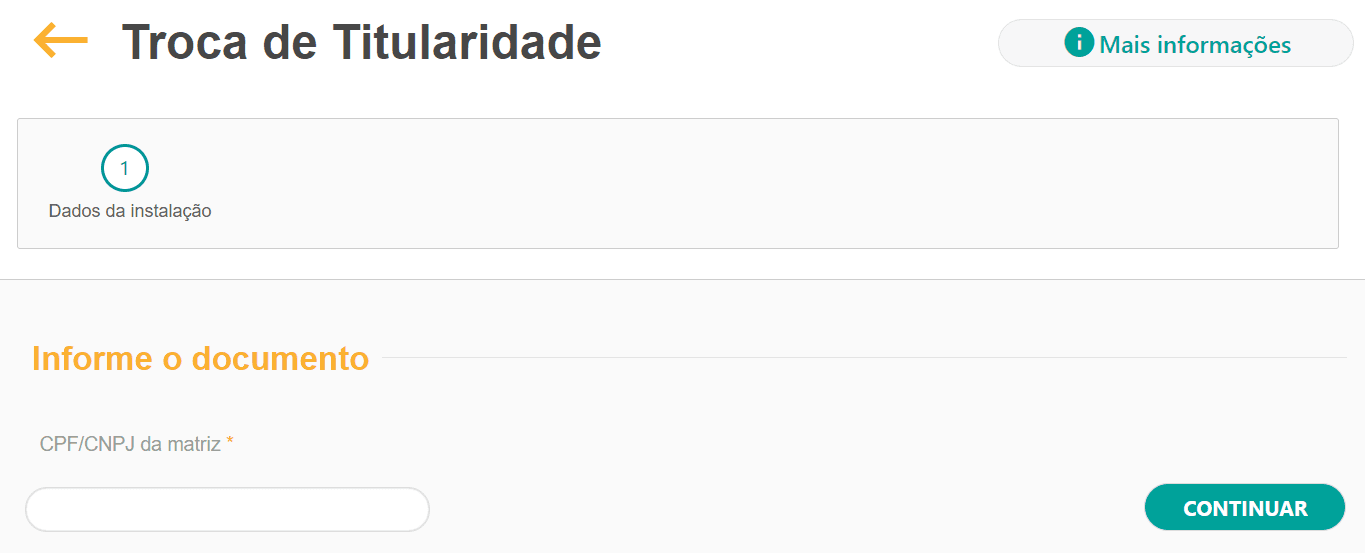 5) No formulário de troca de titularidade, informe os dados da instalação, começando pelo CPF ou CNPJ do novo titular.
