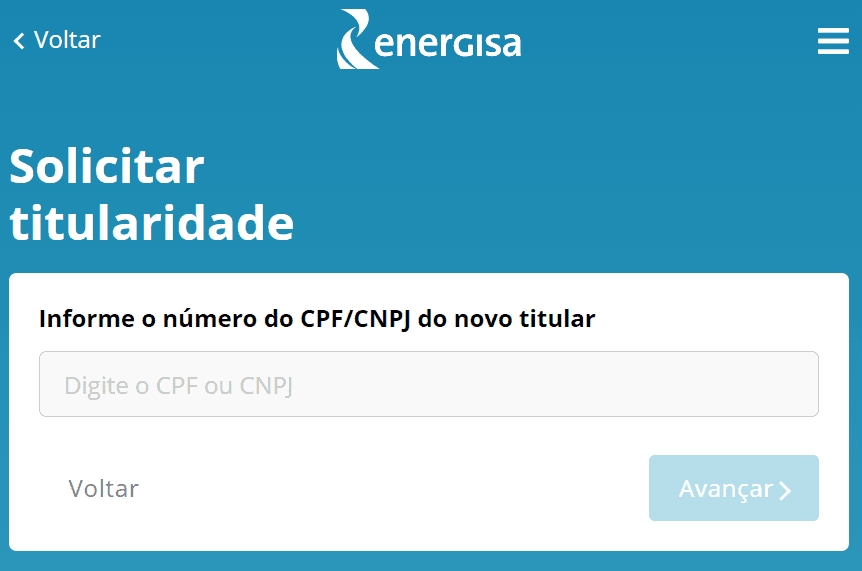 3) Você será direcionado para o link: m.energisa.com.br/mudanca-titularidade. Informe o CPF, ou CNPJ se for o caso, do novo titular da conta.