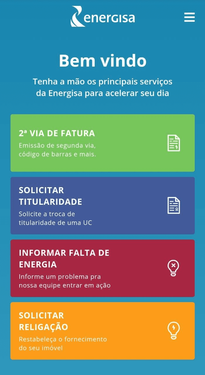 1) No navegador do seu smartphone, acesse m.energisa.com.br. Abrirá um menu com alguns dos serviços principais disponibilizados pela Energisa. Selecione Solicitar titularidade.